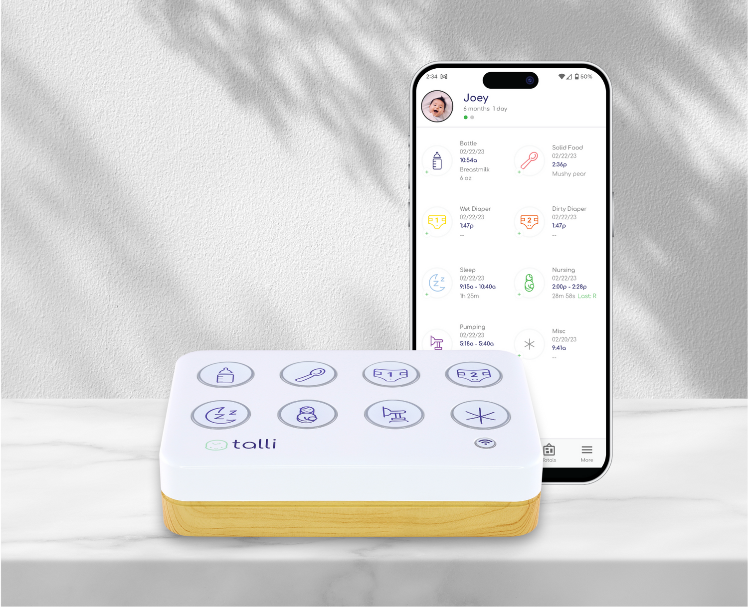 Logging takes less than a second with Talli! Record diapers, bottles, sleep & more with one press. The Talli Baby One-Touch Tracker is our flagship product, created by a tired mom, to make keeping track just a little bit easier.