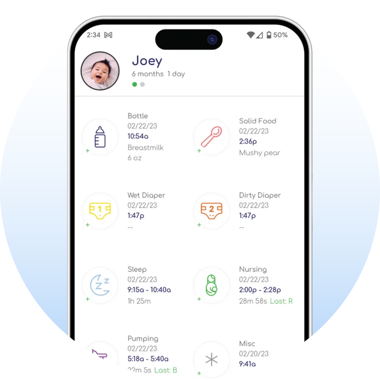 Easy logging to be sure baby’s getting what they need no matter who’s providing the care. And your data is stored securely in the app so you can see it anytime, anywhere.