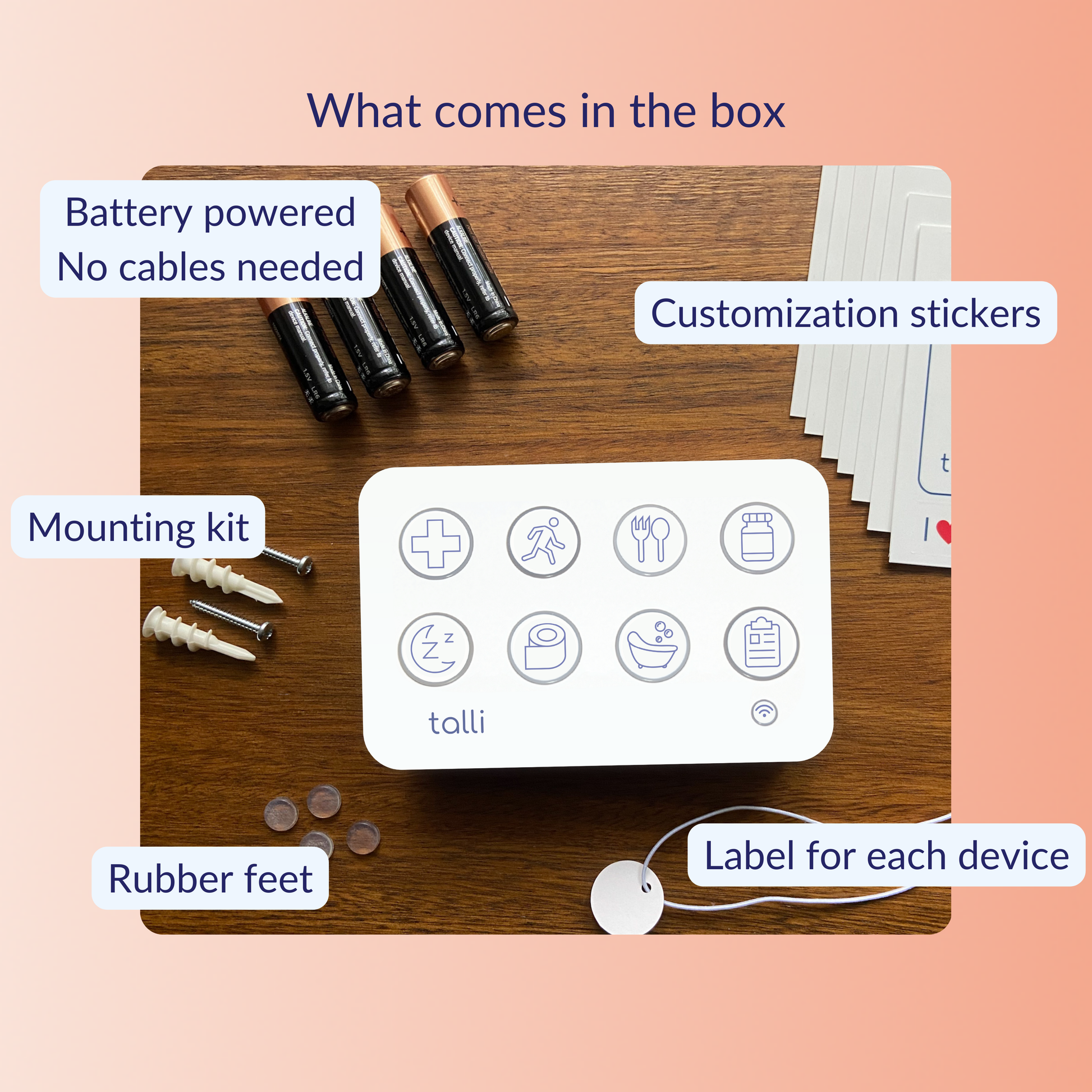 - It’s faster and easier. Apps are great. But even the best apps take multiple steps to log any event. New parents are often logging 15-20 events per day 24/7. The Talli device gives you the option to just hit a button on your way into or out of the nursery at 3 am. Or press a button with your knuckle after changing a dirty diaper. No need to find your phone or navigate through multiple steps. It’s one step and one second. This reduction in time and friction at each event really adds up over the course of a day or week.